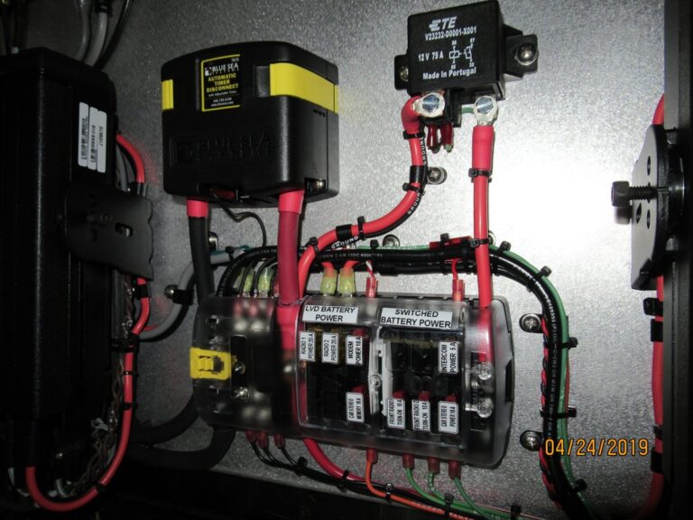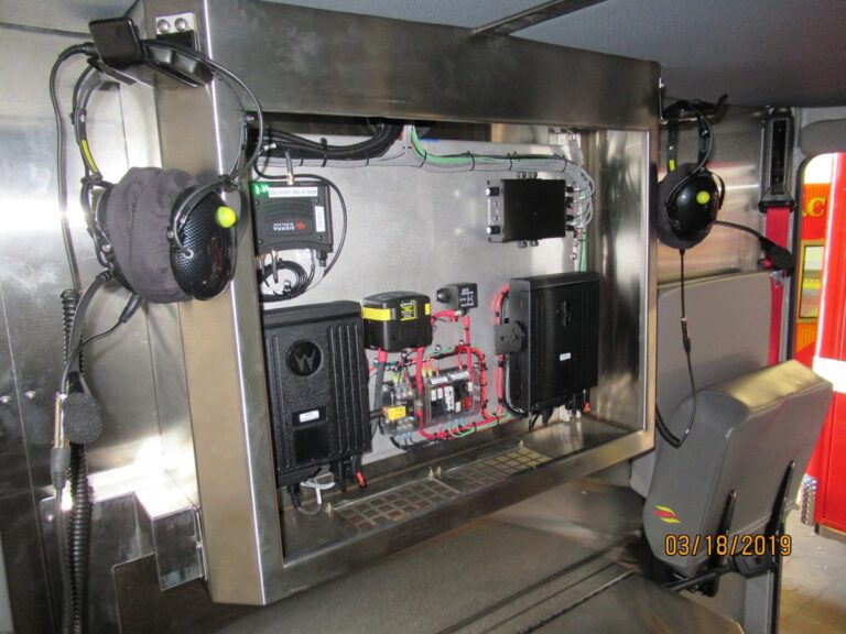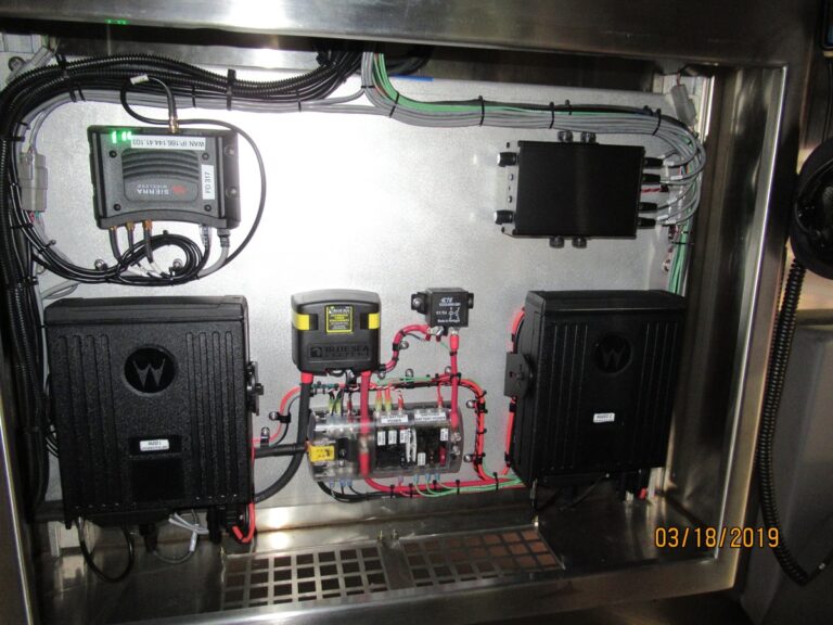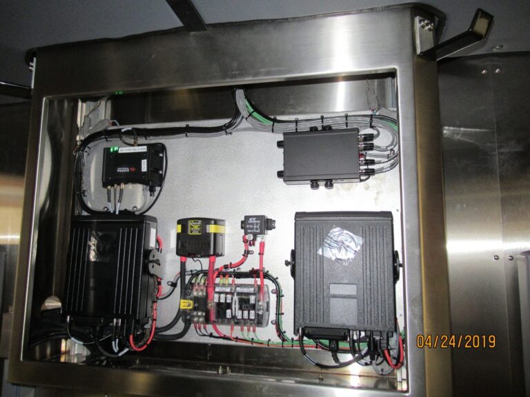 - Custom Communications Cabinet with Power Distribution, radios, intercom system, modem, and Low Voltage Disconnect. Custom wire chase from the floor to the cabinet