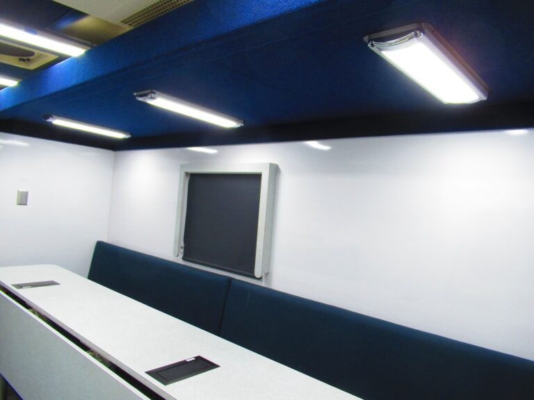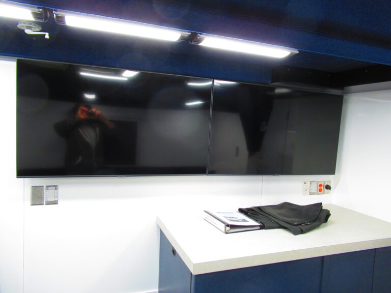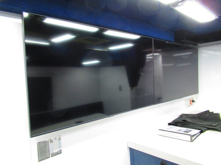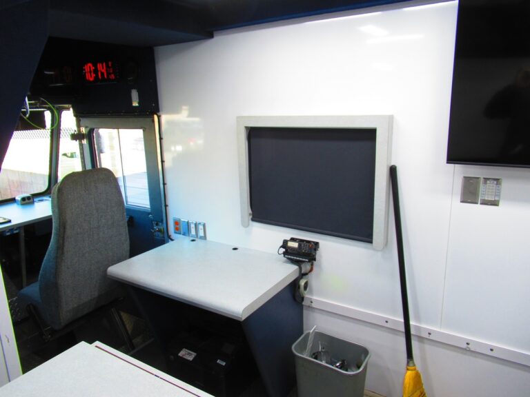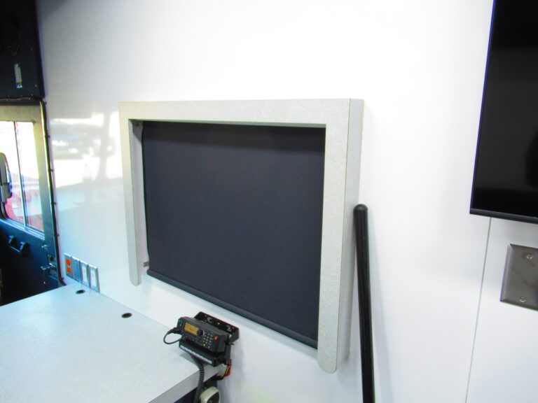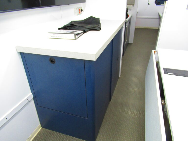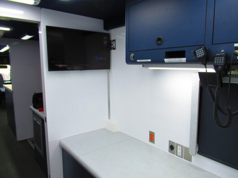 911Vehicle Custom Rear Command Center pull-out command desk and side cabinets 60% seat communications cabinet 32” Rear...